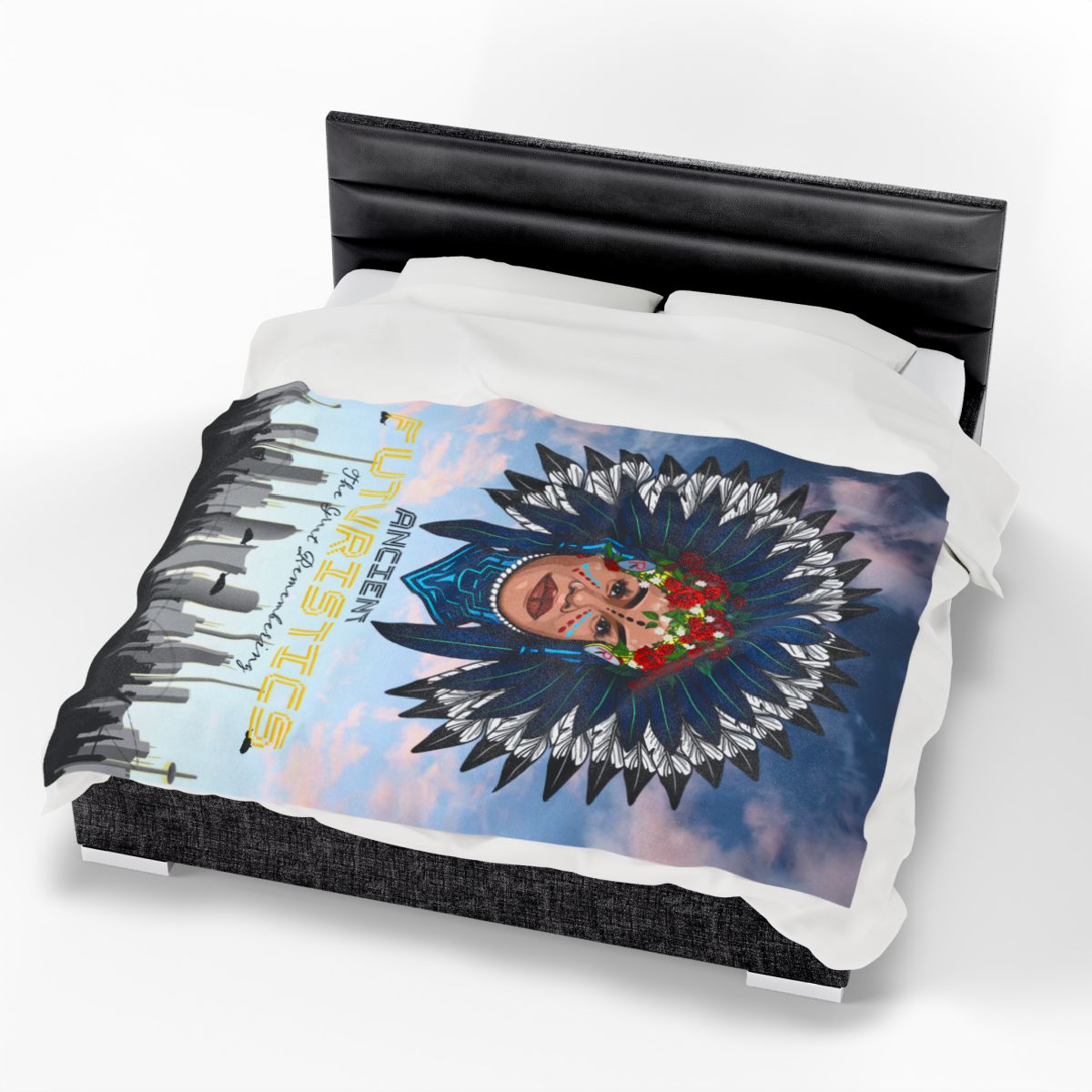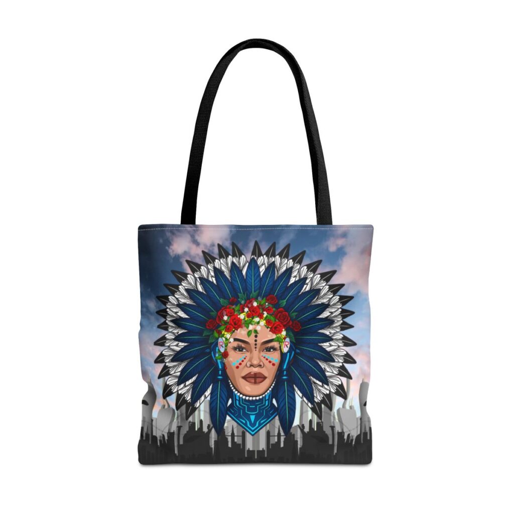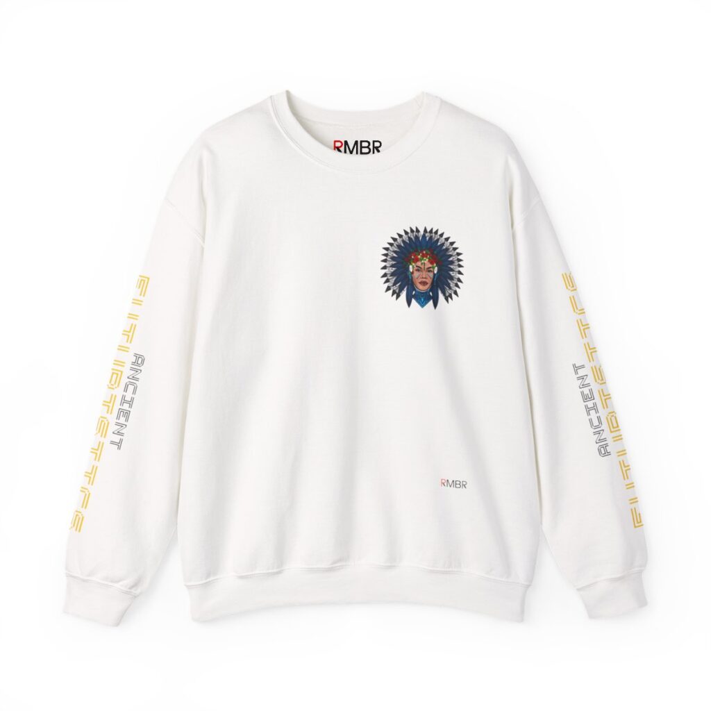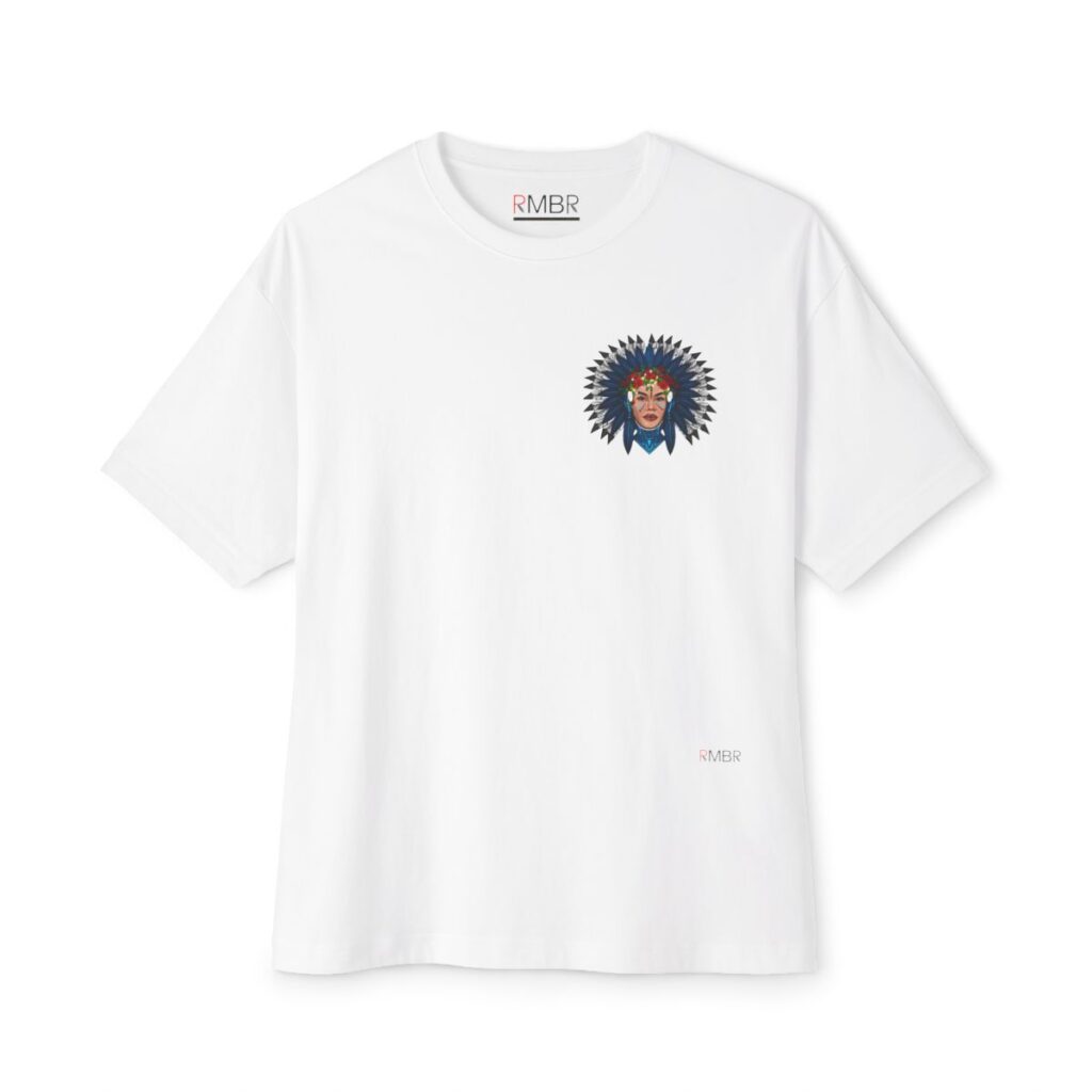 The ANCIENT FUTURISTICS chest logo shirt captures Rose Concrete in full regalia with a radiant blue and white feathered headdress. Red roses woven into her crown. Traditional-style face markings paired with futuristic geometry. And a subtle cybernetic collar suggesting advanced integration