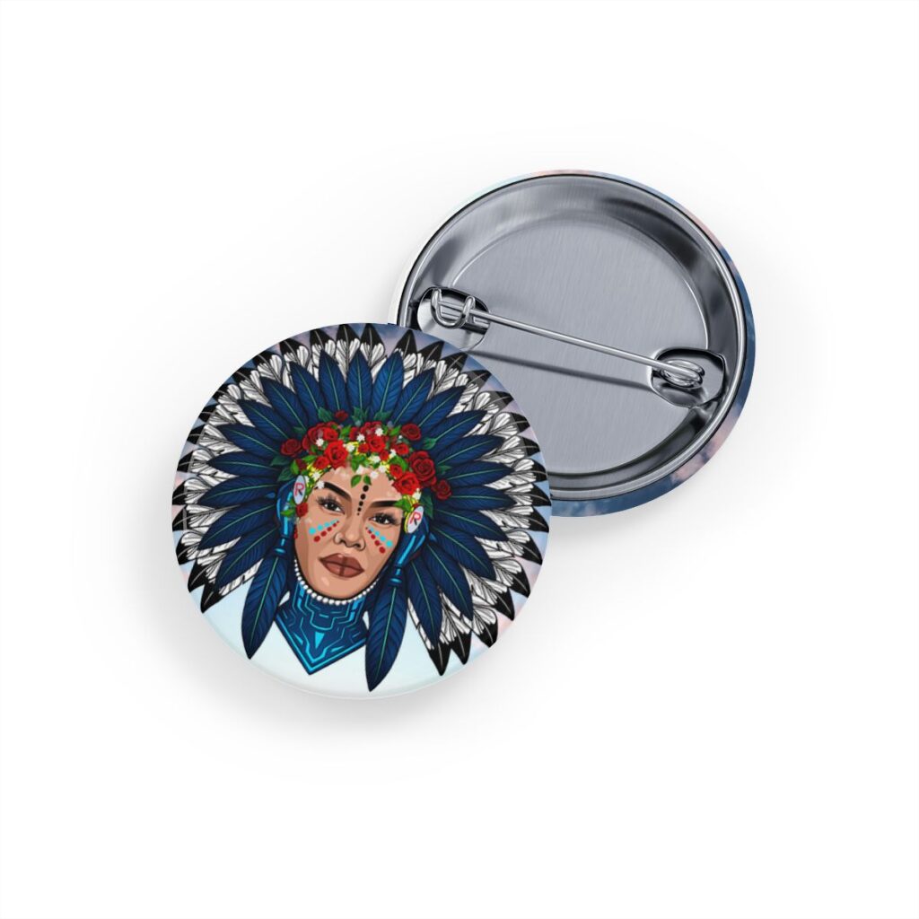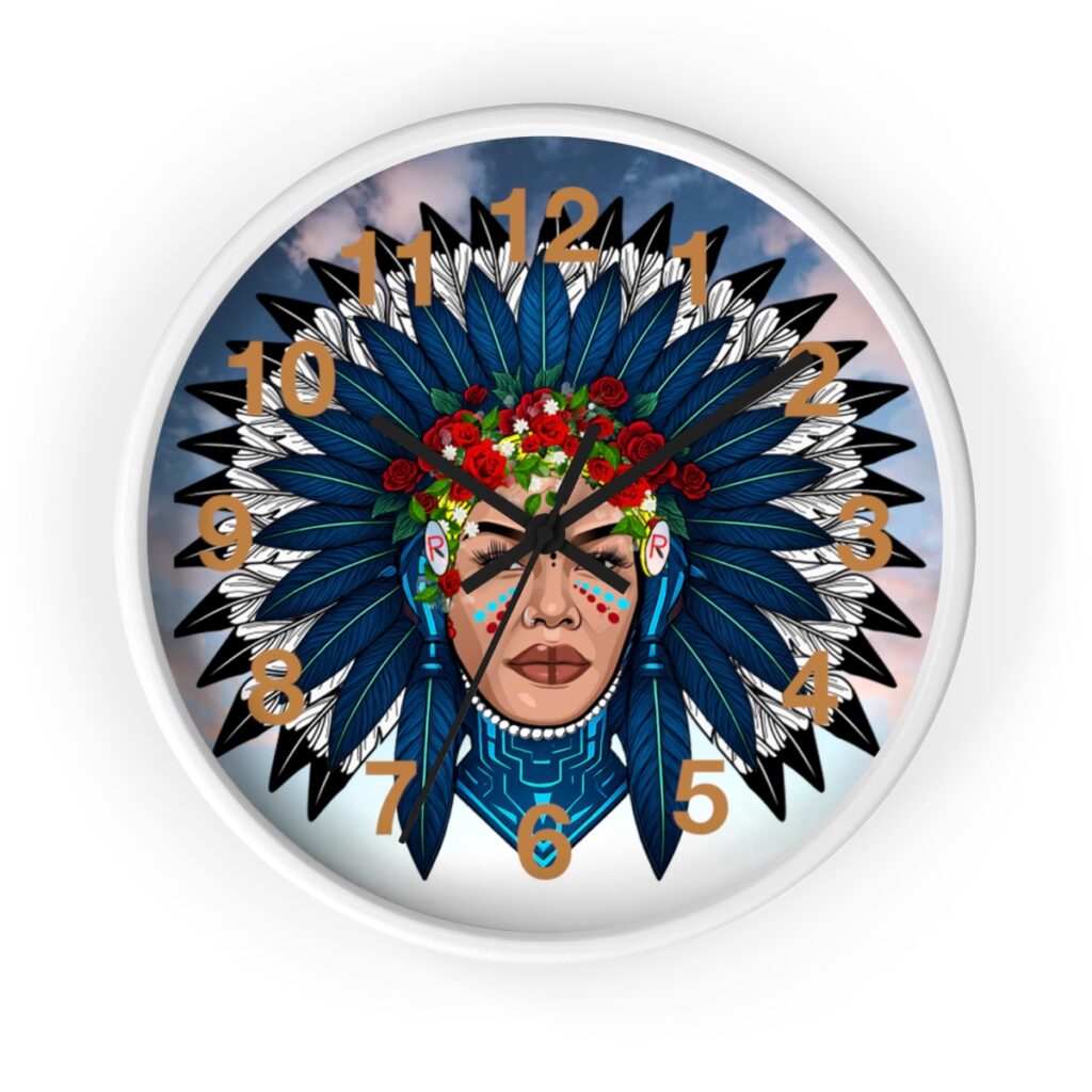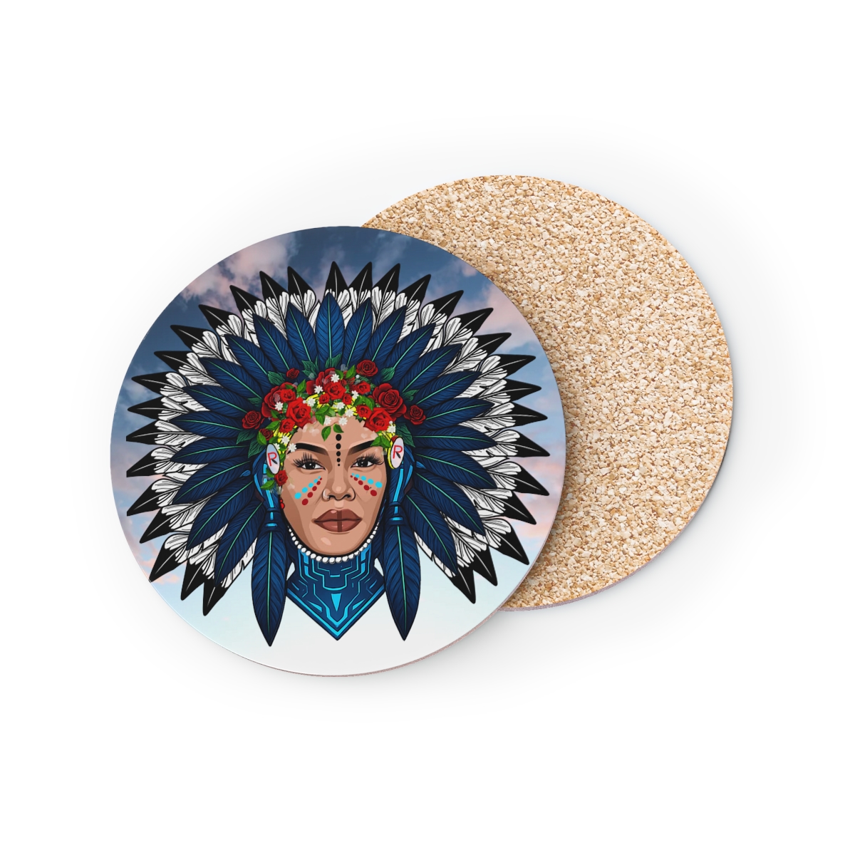 The ANCIENT FUTURISTICS chest logo shirt captures Rose Concrete in full regalia with a radiant blue and white feathered headdress. Red roses woven into her crown. Traditional-style face markings paired with futuristic geometry. And a subtle cybernetic collar suggesting advanced integration