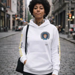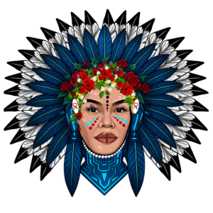 The ANCIENT FUTURISTICS chest logo shirt captures Rose Concrete in full regalia with a radiant blue and white feathered headdress. Red roses woven into her crown. Traditional-style face markings paired with futuristic geometry. And a subtle cybernetic collar suggesting advanced integration