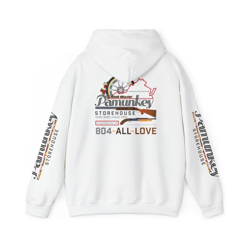 On the back, a captivating graphic emerges – the fictional Pamunkey Storehouse. This imaginative representation symbolizes the enduring spirit of the Pamunkey Tribe and their deep-rooted connection to the region. It serves as a visual testament to the tribe’s resilience, adaptability and the dynamic intersection of tradition and contemporary life.