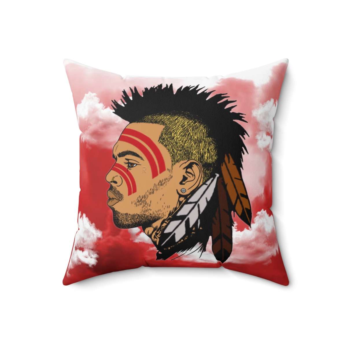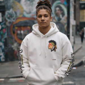 The COOL BREEZE design imagines Chris Brown as a modern Pamunkey warrior. The front graphic presents him in profile with bold red ceremonial paint and feathers rising behind his head. In Indigenous traditions, feathers symbolize honor, wisdom and spiritual connection. The red paint stripes across the face echo ceremonial markings worn by warriors and dancers across many Indigenous cultures. In this visual narrative, Chris Brown becomes more than a global music icon.