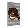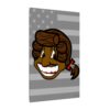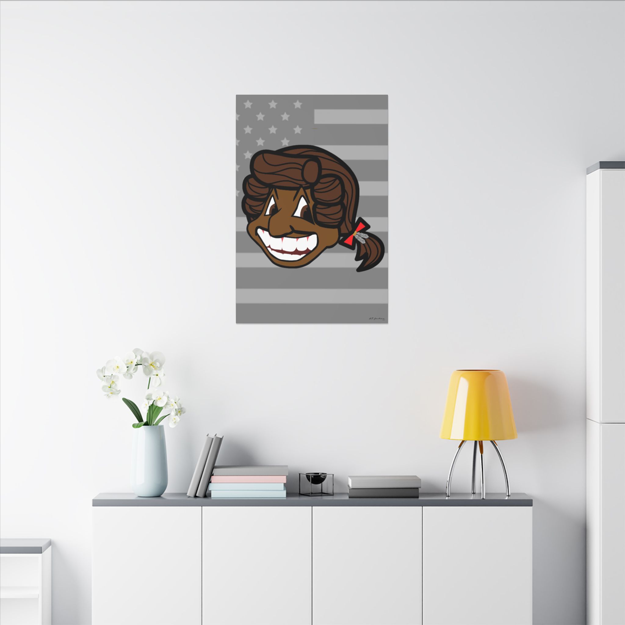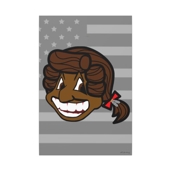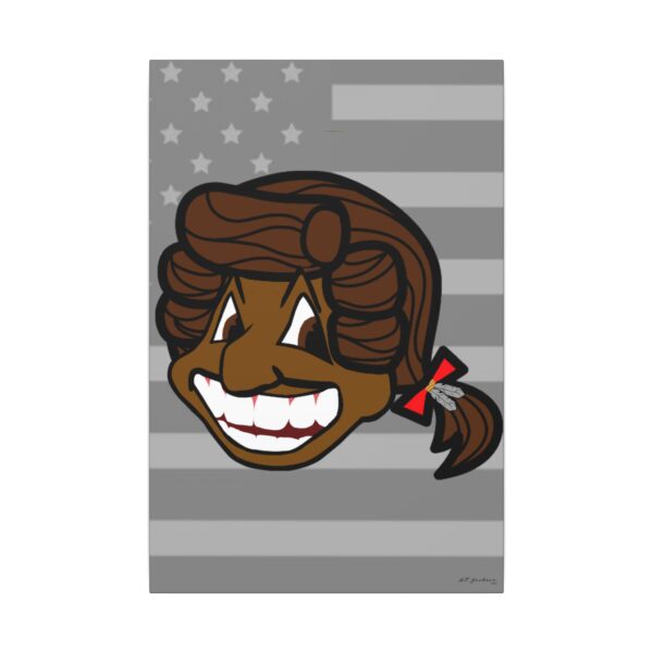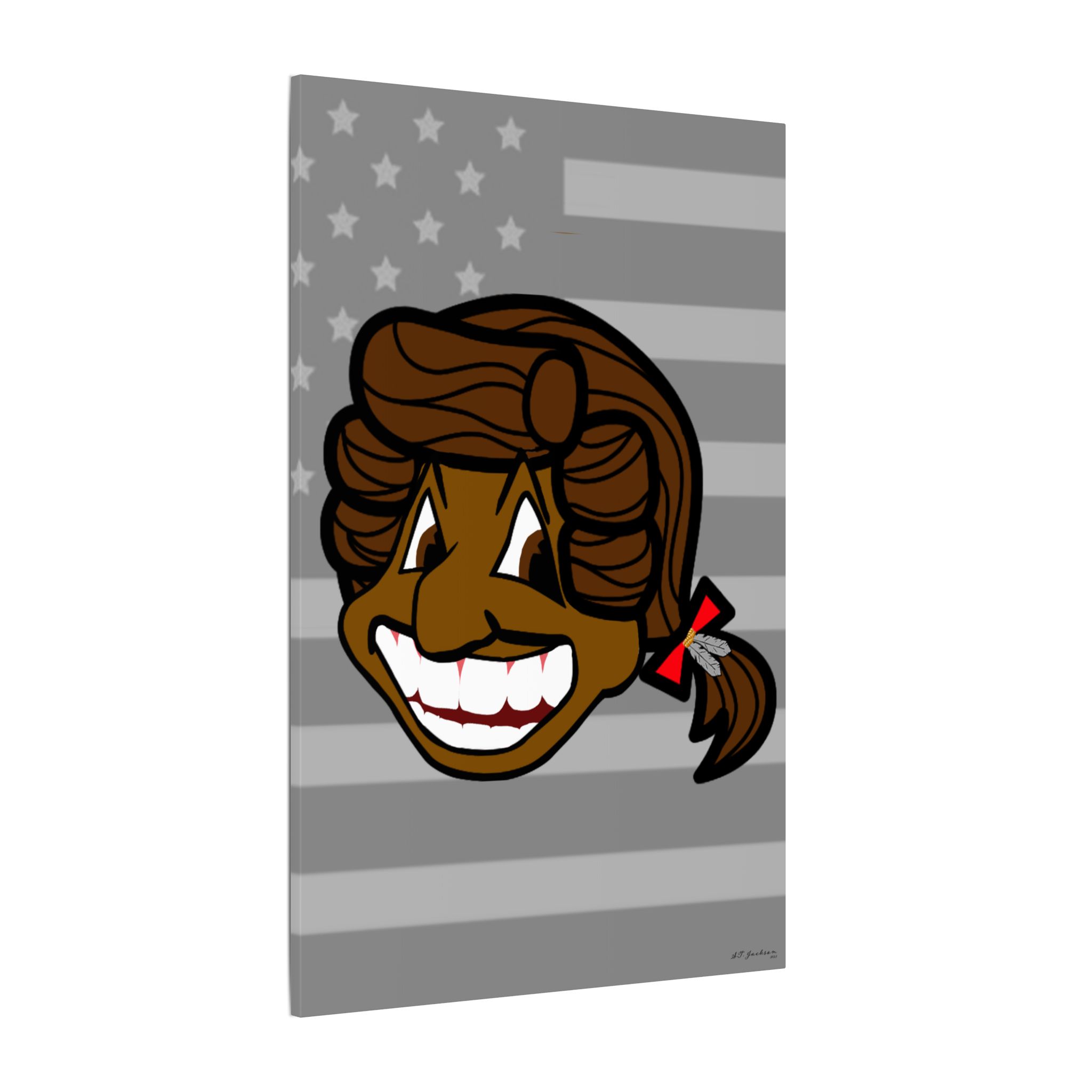 COLONIZED INDIAN a face rewritten, this reinterpretation of the infamous Cleveland Indians logo features a grinning figure with pressed curls, a red ribbon and small grey feathers—elements that capture the contradictions of forced assimilation and modern identity expression. The COLONIZED INDIAN represents the result of centuries of cultural suppression. Where feathers, beads and sacred regalia once adorned Indigenous people, European styles and Christianized customs were imposed through brutal systems of control—boarding schools, missionary campaigns and assimilation acts. What you see in this image is the residue of resistance and survival. The hairstyle speaks to conformity. The gold teeth and exaggerated smile hint at an identity reconstructed in the image of capitalist appeal and pop culture parody. This is the Indian after 400 years of forced erasure—still Indigenous, but wrapped in the aesthetics of colonization. Yet, behind the mask is revival. Despite the forced tongue of English and the mimicry of Western style, Indigenous communities across the continent are RMBR-ing. They’re reclaiming language, regalia, kinship systems and stories once thought lost. This image doesn’t mock, it reminds. The COLONIZED INDIAN is not just a symbol of what was taken—but of what’s being taken back.
