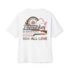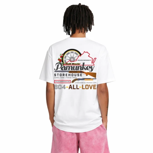Front Logo: Chris Brown as a stylized Pamunkey leader—bold red war paint arcs across his cheek like signal waves, a shaved side fade beneath a tribal hawk and a feathered braid down the neck. A tribute to identity, artistry and ancestry. Back Graphic: A high-impact fictional ad for Still Blazing Pamunkey Storehouse in Tappahannock, VA. Guns, gold rims, roses and the Virginia state map—all centered around the message “804-ALL-LOVE,” because love is what powers the revolution.
