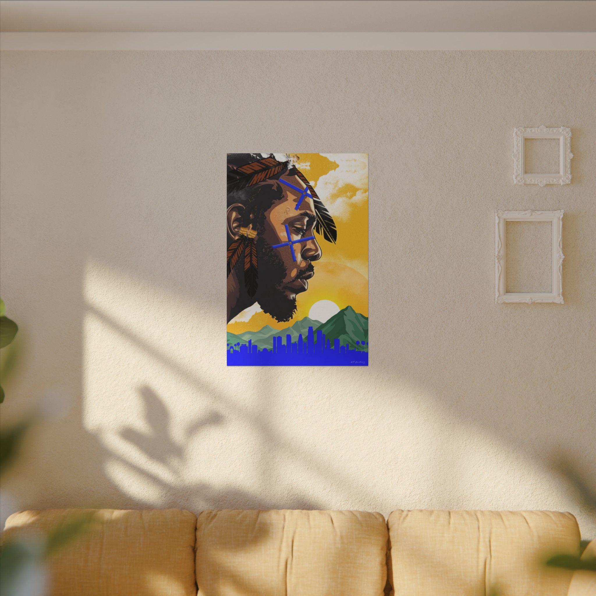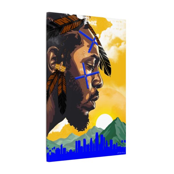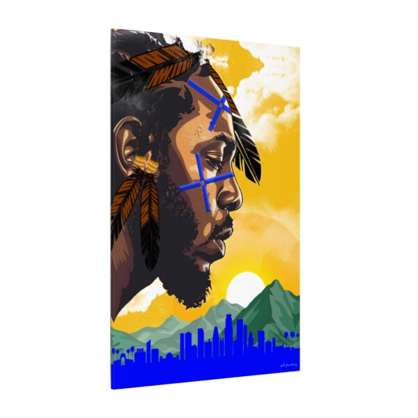 Set against the golden skies of Los Angeles, the city that raised him, this piece pays homage to the roots that shaped Kendrick’s voice. The skyline, nestled between mountains and palm trees, represents the duality of struggle and triumph—the soul of LA. Feathers symbolize strength, while the blue markings signify vision, a testament to the clarity and purpose that Kendrick brings to his artistry.