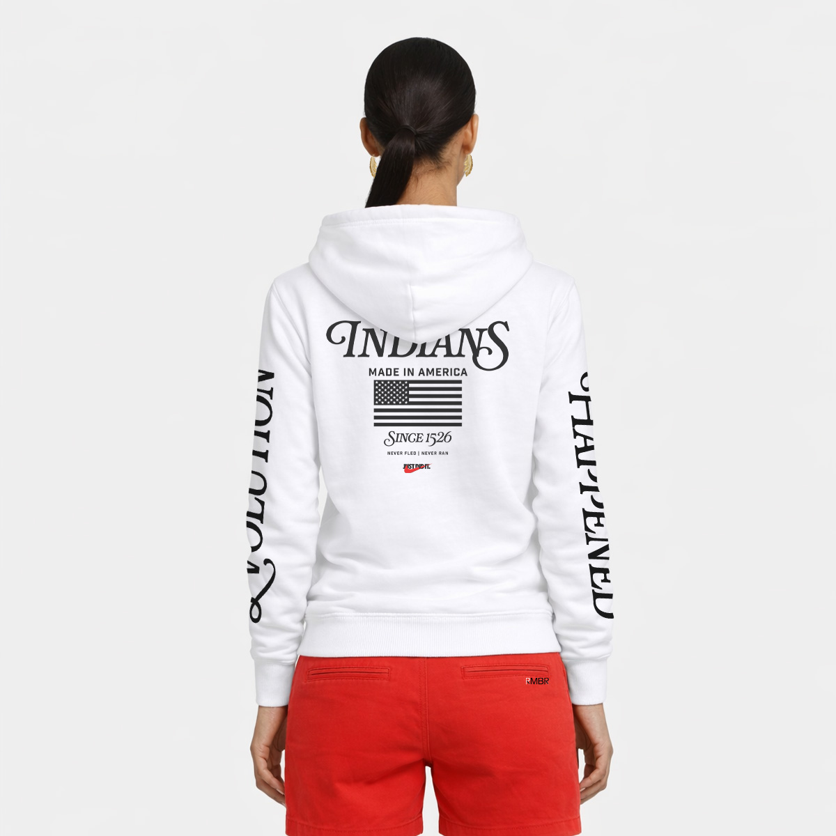 On the back of the shirt, the declaration “Wild Indians — Made in America Since 1526” reframes history. Long before the formation of the United States, long before 1776 became a national myth, Indigenous people lived, built societies and shaped the land now called America. The date 1526 reminds the viewer that, if you called yourself by any tribal name you could be killed on sight. The true story of this continent stretches far deeper than colonial timelines. The line “Never Fled | Never Ran” reinforces the central message: survival. And down the sleeves, “Evolution Happened”, meaning the American Indian has went many changes to become who s/he is today. Despite forced migrations, reclassification and cultural suppression, the spirit of the original people never disappeared. It adapted, endured and eventually began remembering itself again.