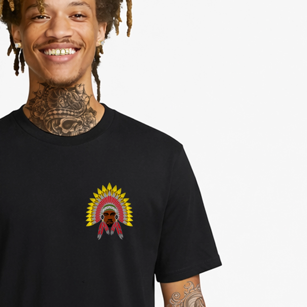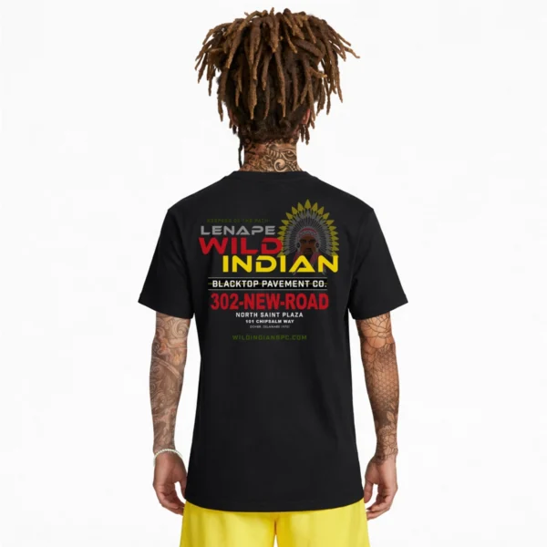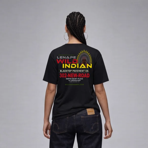 Introducing MOSKIM YE, an oversized tee that honors the legacy of the Lenape (Delaware) Nation while reimagining one of today’s most influential figures—Ye—as a Lenape chief. “Moskim,” meaning “shapeshifter” in Lenape tradition, represents transformation, resilience and Indigenous survival. On the front, this fictional alternate history envisions Ye had colonization never happened, embodying the strength, brilliance and boldness of Lenape leadership. The back of the tee features a mock ad for WILD INDIAN Blacktop Pavement Co., a creative nod to the Lenape’s sacred role as “Keepers of the Path.” The tagline ties directly to their spiritual responsibility and generational endurance, turning a construction company into a cultural metaphor. This shirt isn’t just style—it’s storytelling.