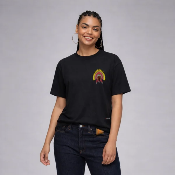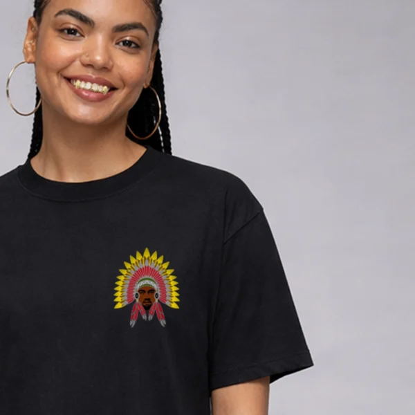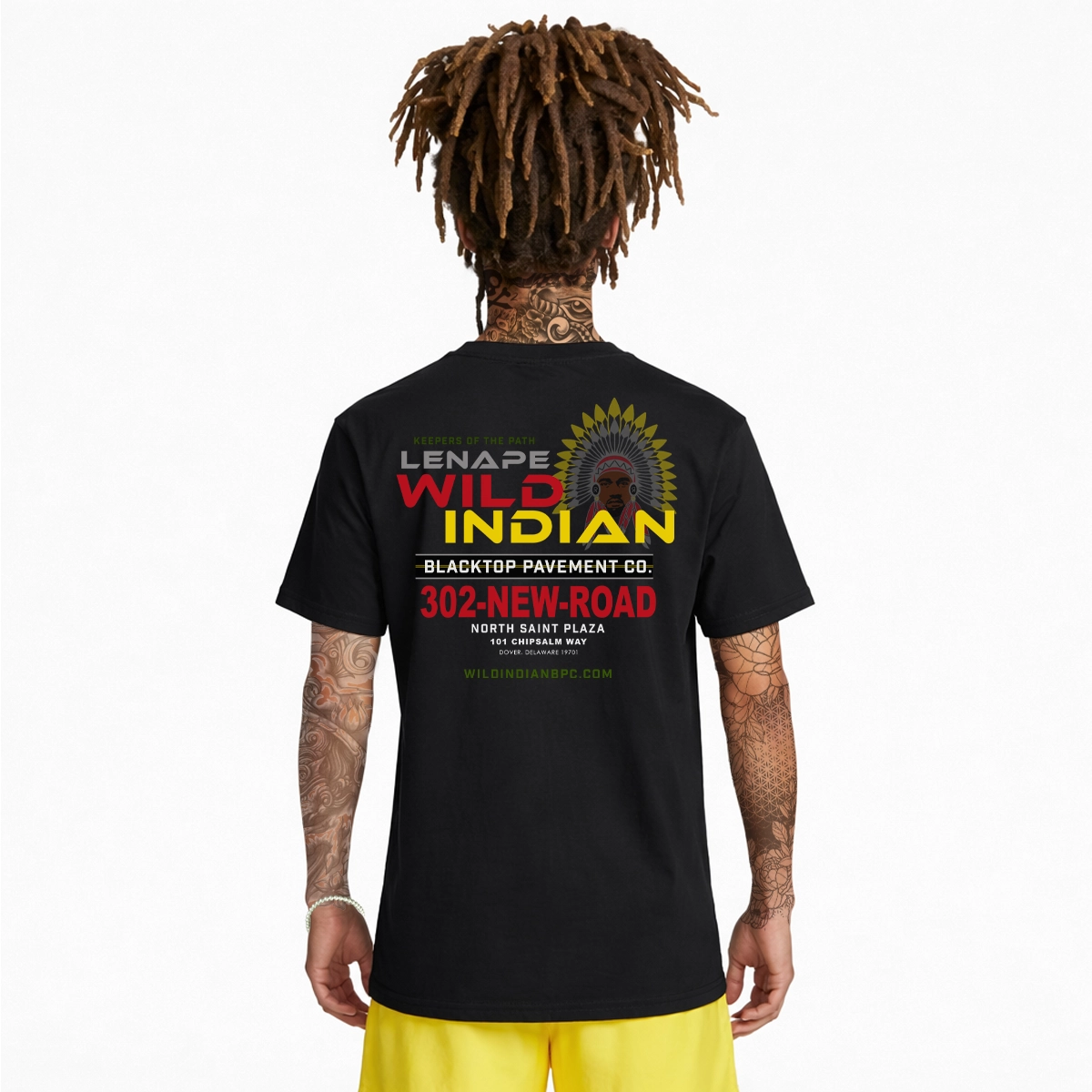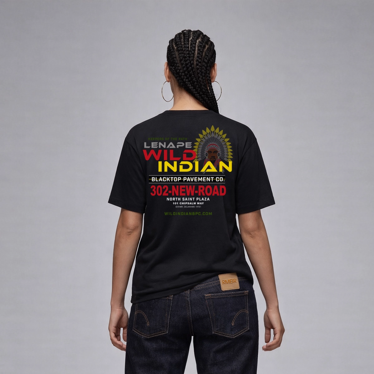 Front Logo: A powerful redesign of Ye wearing a full Lenape chief headdress in vibrant yellow, red, grey, and green. The “R” side medallions hint at royalty and remembrance. This image honors what could’ve been if American Indian history had never been disrupted. Back Print: A full-page ad-style graphic for WILD INDIAN Pavement Co., complete with bold fonts, roadwork motifs, a 302-area code phone number and a clean call to action—“Keepers of the Path”. It represents rebuilding, legacy and mobility through an Indigenous lens. Fit & Feel: This is a soft heavyweight oversized tee—cut wide for movement and layering. Stays breathable, yet substantial enough to carry the bold message.