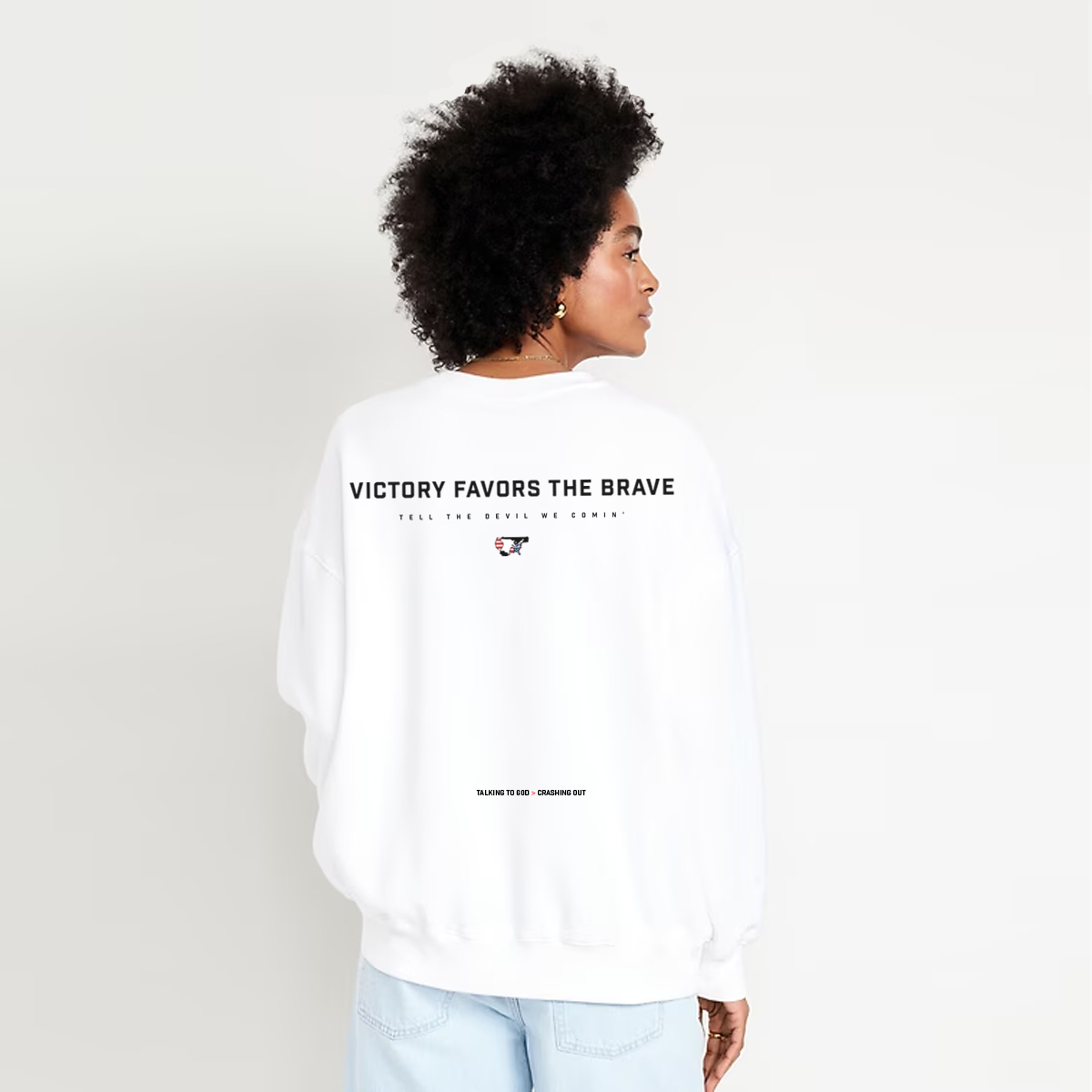 The PEACE AND ORDER oversized sweatshirt is a bold tribute to heritage, protection and the unshakable bond between the American Indian (Black American) identity and the land. The front graphic — a fearless, childlike warrior brandishing a tomahawk and revolver — reclaims the historical nickname “Son of a Gun”, once used to describe Indigenous resistance to colonization. The back reinforces this warrior ethos with the phrase “Victory Favors the Brave” and the warning “Tell the Devil We Comin’”—a spiritual and ancestral call to arms. Bottom of shirt back, the phrase “Talking to God > Crashing Out” centers the deeper truth: survival and divine alignment outweigh destruction.
