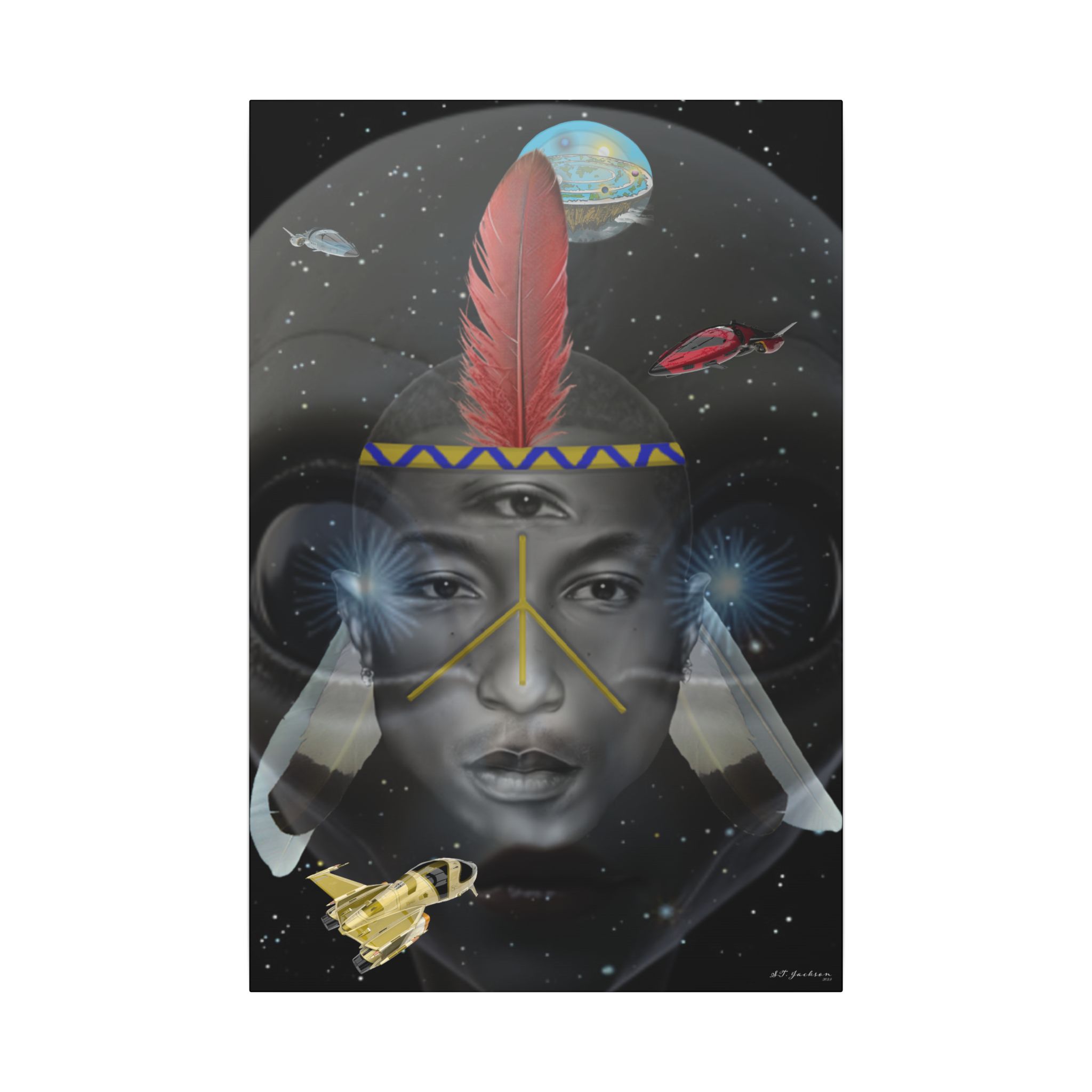 Introducing PHARELIEN, a tribute to the Tidewater Area’s very own Pharrell Williams. We reimagined P, as a ancient futuristic American Indian, juxtaposed in front of alien with the Flat Earth in the background and flying positioned all around. This unique and visionary design captures the essence of innovation and cultural heritage. Crafted with artistic flair and style, PHARELIEN symbolizes the boundless potential of cultural fusion and the enduring spirit of creativity, all things are on the table nowadays. Hang it proudly to showcase your appreciation for Pharrell Williams’ groundbreaking work and to ignite conversations about the limitless possibilities of art, culture and beyond. Let PHARELIEN inspire you to embrace our blend of tradition and innovation, celebrating the evolution of creativity in an ever-changing world, we know the huemans have finally waken up!