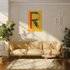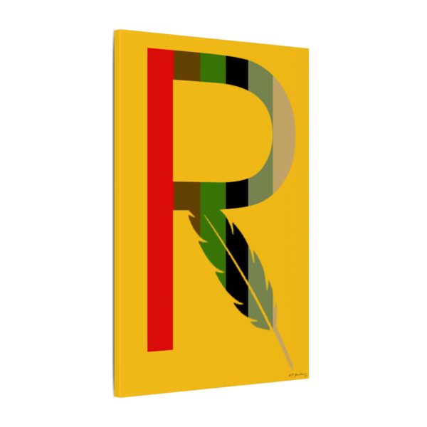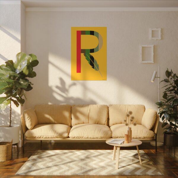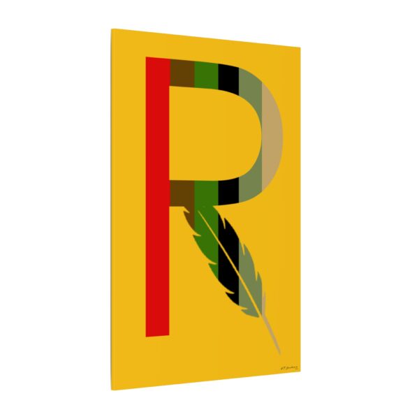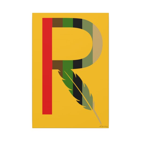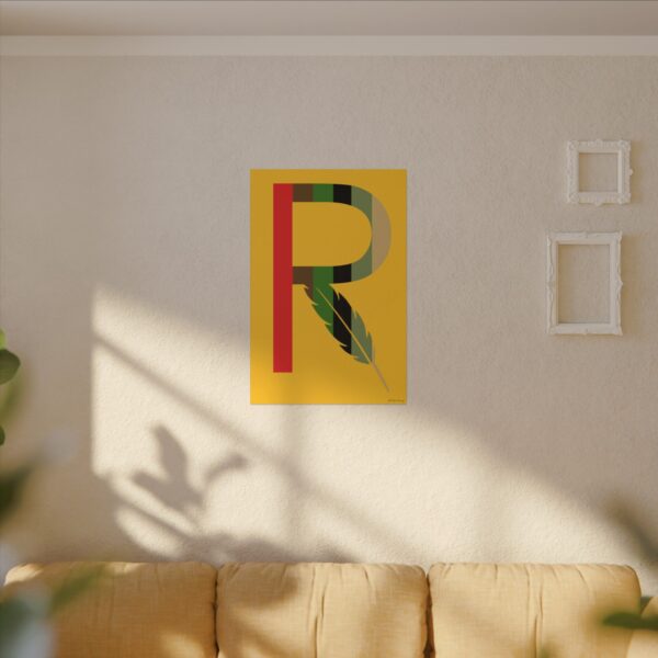 Introducing our captivating print, RMBR JUSTICE logo print on a gold background. The RMBR JUSTICE is the RMBR logo which is a R with a feather combined. This striking artwork is about remembering the past in hopes for a better future. Hang this print up in your home to bring that good energy.
