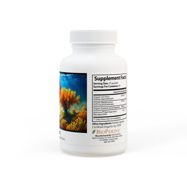 Ingredients: Organic Irish Moss (Chondrus crispus)(whole plant), Organic Burdock (Arctium lappa)(root), Organic Bladderwrack (Fucus vesiculosus)(whole plant), BioPerine® (Black Pepper Extract), (Piper nigrum)(fruit). Other Ingredients: Pullulan Capsules.