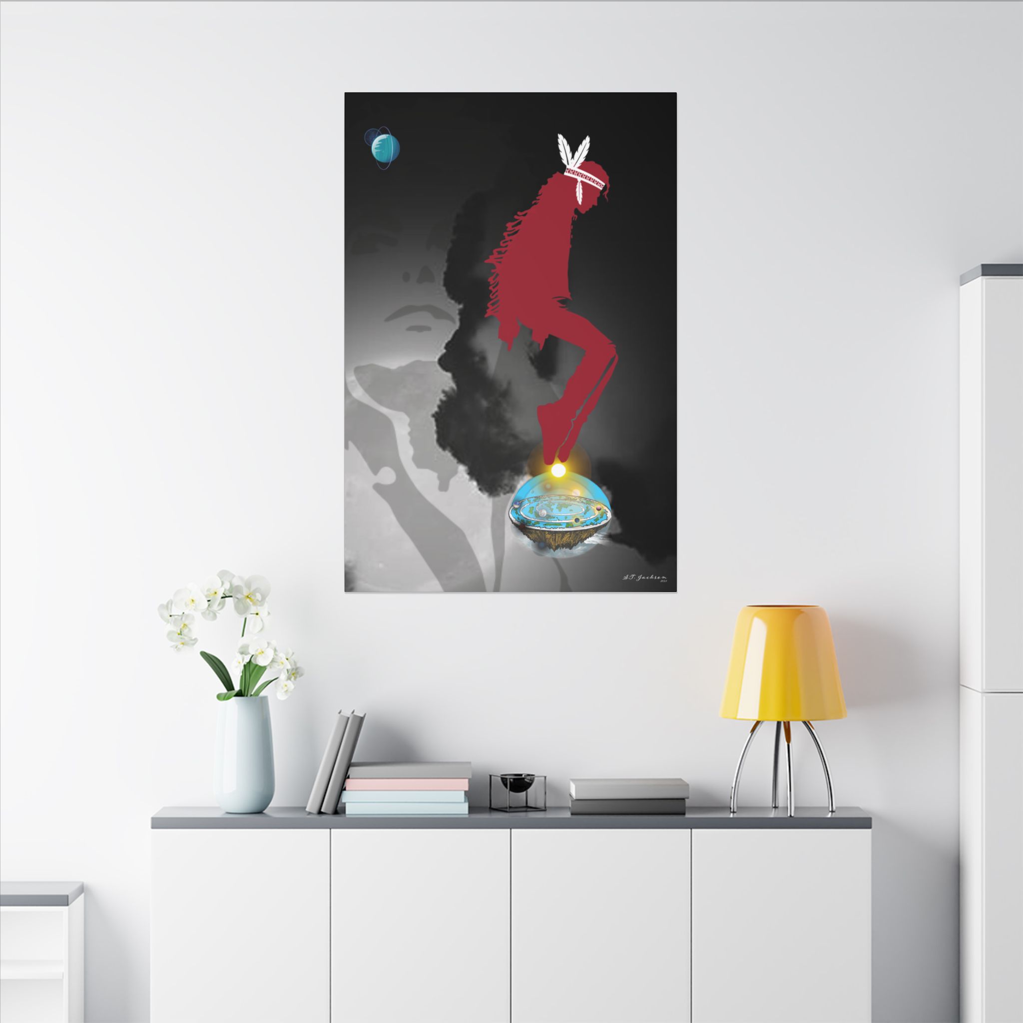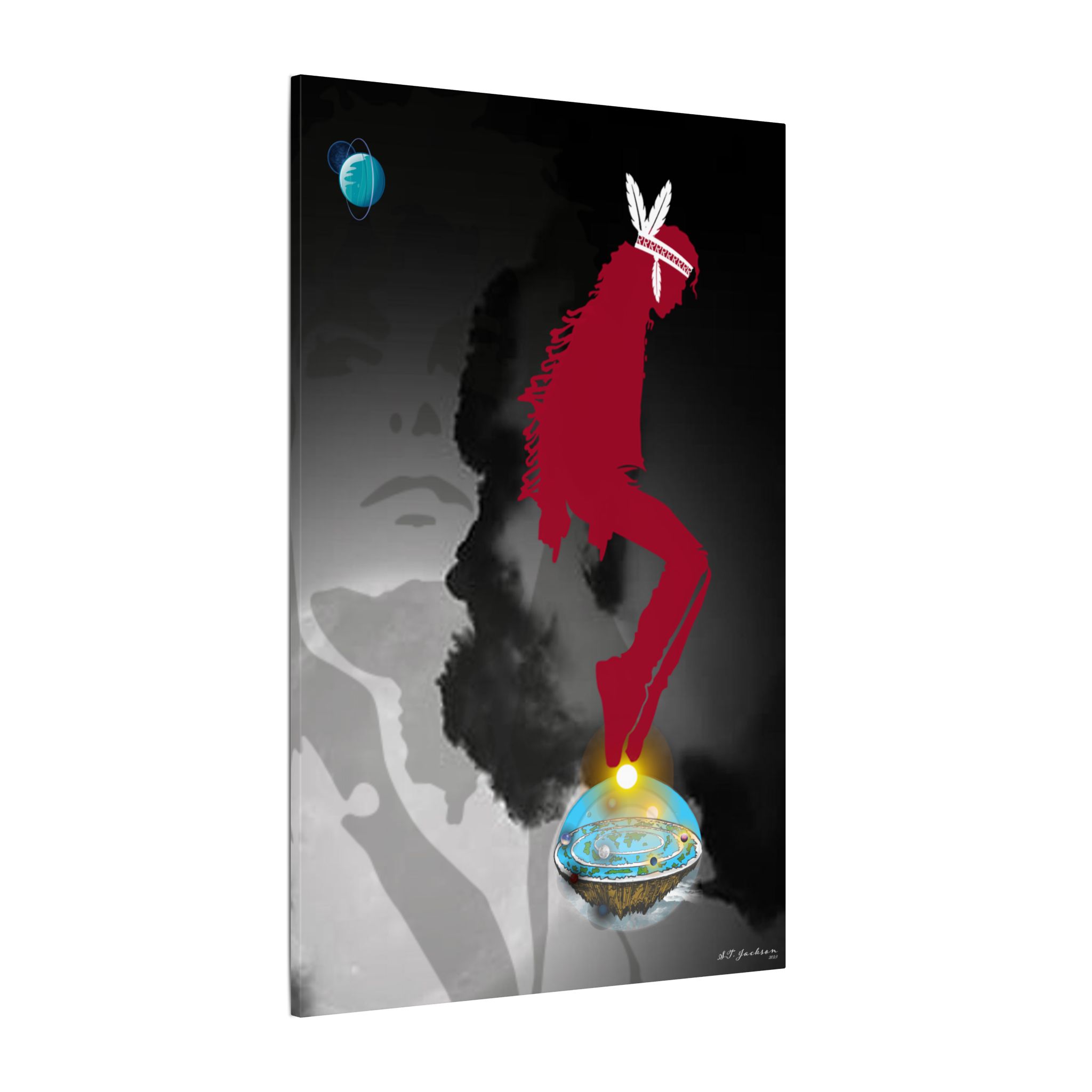 This piece also carries profound cosmological symbolism, illustrating the balance between the Flat Earth within the firmament, a concept deeply rooted in ancient indigenous and spiritual traditions. The moonlit sky in the background reflects the duality of light and darkness, a theme often seen in MJ’s music and performances. Just as the firmament holds the celestial bodies in perfect harmony, so too does this artwork honor the connection between the earthly and the divine, between ancestry and legacy.