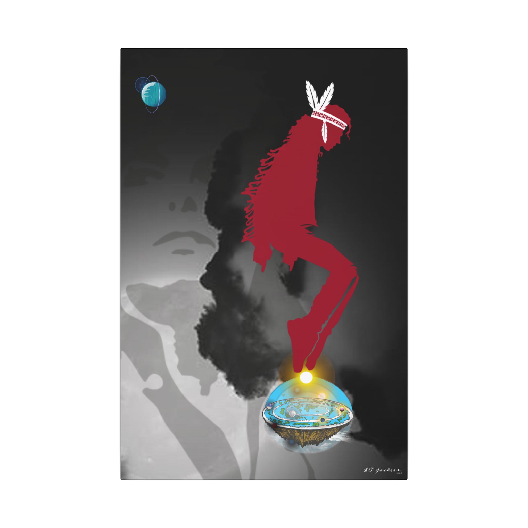 The Choctaw people have a storied history, known for their deep spiritual connection to the elements, particularly the sun, which they revered as a guiding force of life and balance. This artwork embodies the essence of the Sun Walkers, a term tied to the ceremonial dance traditions of the Choctaw, symbolizing resilience, movement and transcendence. The depiction of MJ with feathers and celestial elements represents his spiritual elevation and the ancestral connection to his indigenous roots. Michael Jackson, the King of Pop, was not only a global icon but also someone with deep familial ties to the American Indian heritage. His Choctaw ancestry is reflected in the themes of unity, dance and spirituality woven into his life’s work. From his ethereal performances to his humanitarian efforts, MJ embodied the spirit of the Sun Walker—illuminating the world with his artistry while carrying the wisdom of those who came before him.