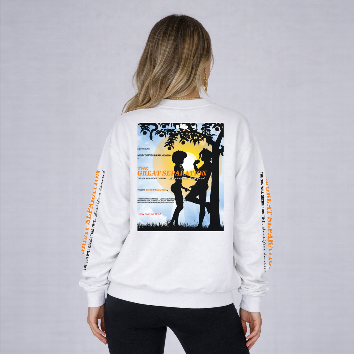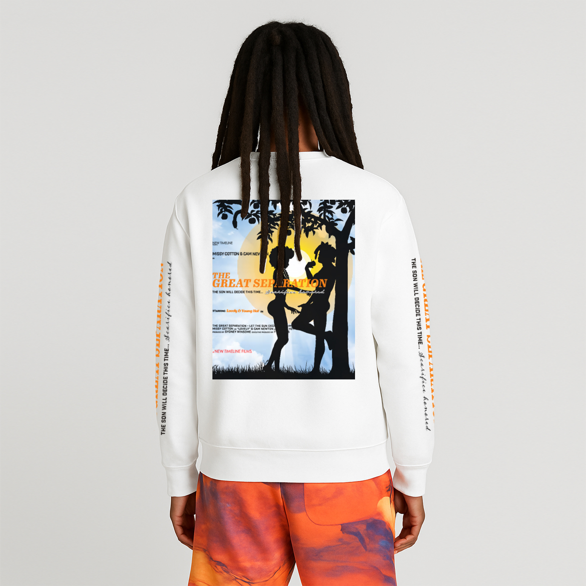 Introducing THE GREAT SEPARATION – Let the Son Decide, a captivating oversized sweatshirt inspired by the upcoming cinematic epic from New Timeline Films. Drawing from the ancient parable of Adam and Eve, this bold reimagining casts the spotlight on a new kind of choice—one made by the sun itself. On the front, a powerful portrait of Young Hot (Cam Newton) is crowned in freeform locks and tobacco leaves, locked in the glow of a setting sun. Beside him, the movie title reads: “THE GREAT SEPARATION – The Son Will Decide This Time…sacrifice honored.” On the back, two striking silhouettes—Lovely (Missy Cotton) and Young Hot (Cam Newton)—stand under the Tree of Questions, its fruit heavy with meaning. As Young Hot offers fruit and Lovely balances between hesitation and hunger, the image captures the heat of decision, desire and divine intervention.