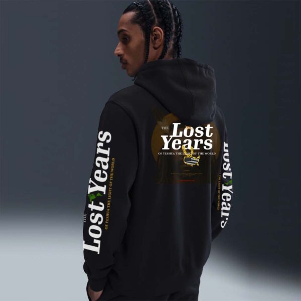 Step into the untold story with THE LOST YEARS, a bold hoodie inspired by the speculative film The Lost Years – Of Yeshua, the Light of the World. Blending historical mystery, indigenous heritage and Afrofuturist vision, this piece is more than merch — it’s a wearable disruption of conventional history. Front: The Lost Years logo and gold-chain pendant shaped like the United States, highlighting the story’s connection to the Americas and the re-centering of origin narratives. Back: A fictional movie poster featuring Ben Blackman and Amore Trouble, alongside a powerful depiction of Yeshua (Jesus) as a Black Indigenous figure wearing a feathered headdress, haloed in golden light — a visual reclamation of identity, dignity and divinity.