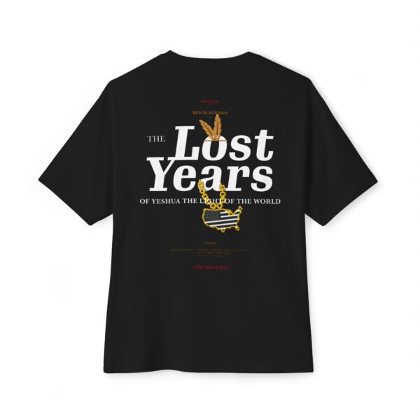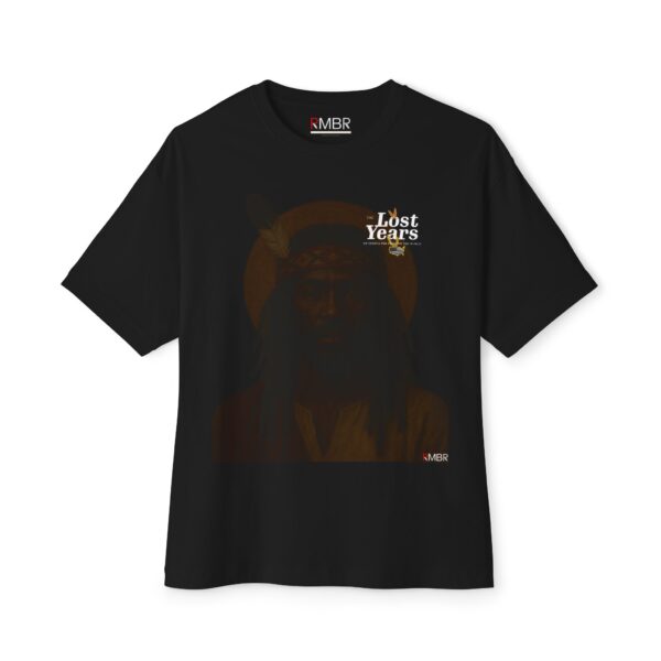 Step into the untold story with THE LOST YEARS, a bold oversized tee inspired by the speculative film The Lost Years – Of Yeshua, the Light of the World. Blending historical mystery, indigenous heritage and Afrofuturist vision, this piece is more than merch — it’s a wearable disruption of conventional history. Front: A powerful depiction of Yeshua (Jesus) as a Black Indigenous figure wearing a feathered headdress, haloed in golden light — a visual reclamation of identity, dignity and divinity. Back: A fictional movie poster featuring Ben Blackman and Amore Trouble, alongside a gold-chain pendant shaped like the United States, highlighting the story’s connection to the Americas and the re-centering of origin narratives. Boxy, oversized silhouette with clean drop-shoulder cut. Soft heavyweight cotton, built for impact and comfort. Illustrated with reverence layered with symbolism!