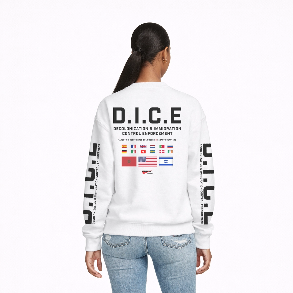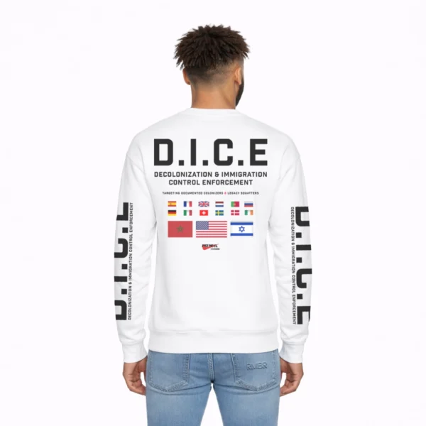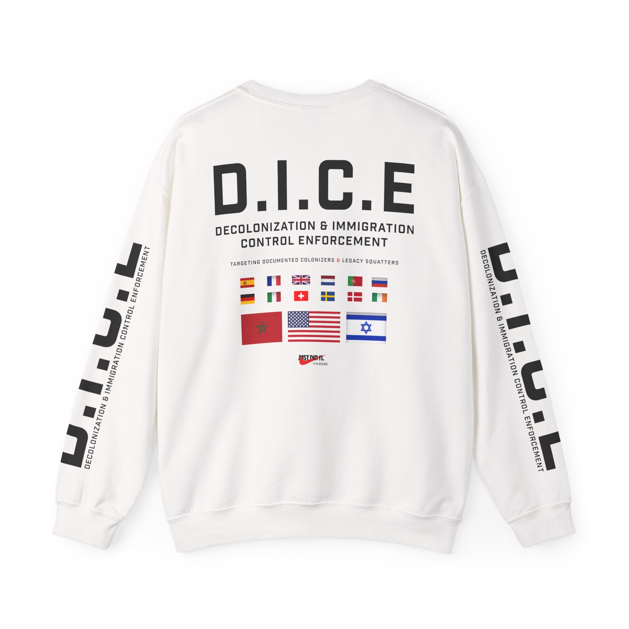 Flip the sweatshirt over and the message expands: D.I.C.E. — Decolonization & Immigration Control Enforcement. D.I.C.E. represents a tribunal of historical accountability — an idea, not an army. Its mission? Audit the past. Examine land seizures, broken treaties, erased census categories and economic displacement. It asks uncomfortable questions: Who benefited? Who was reclassified? Who built wealth — and who inherited it? The sleeve flags symbolize global powers that shaped the colonial marketplace — not as targets, but as reminders that colonization was international business. “Just Did It — To The Indigenous” flips corporate bravado into historical commentary. Because exploitation was marketed as progress. Removal was branded as destiny. Extraction was called expansion.