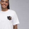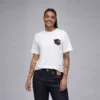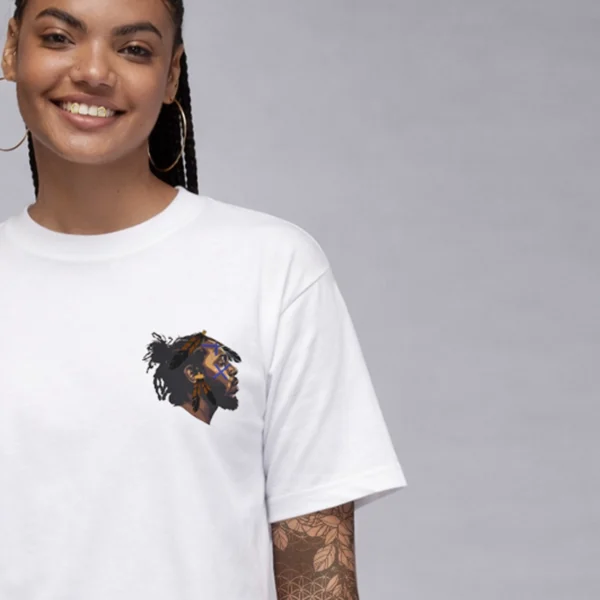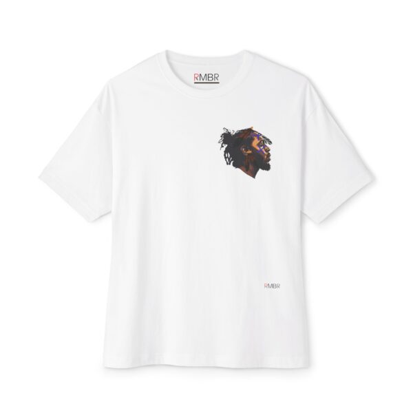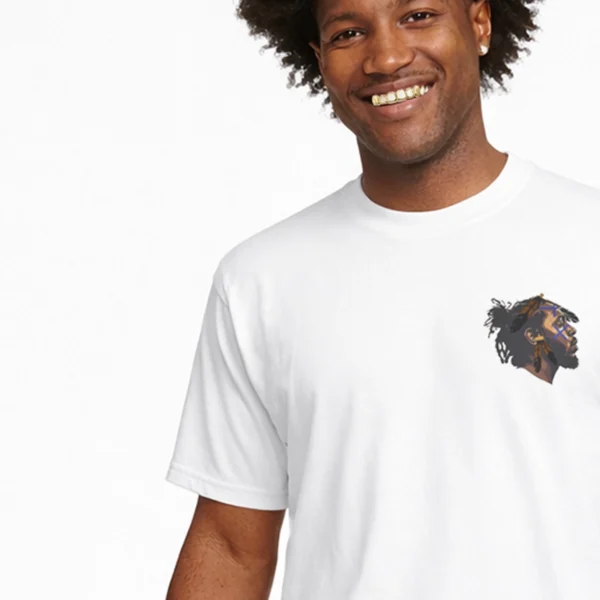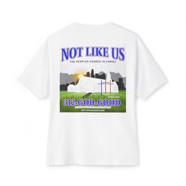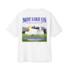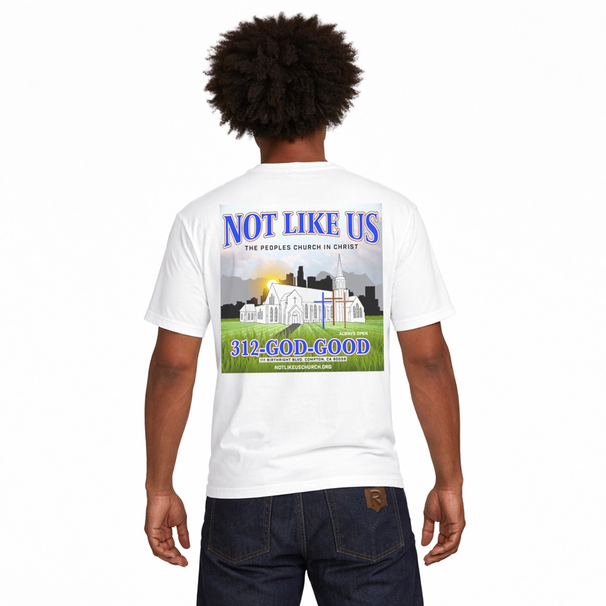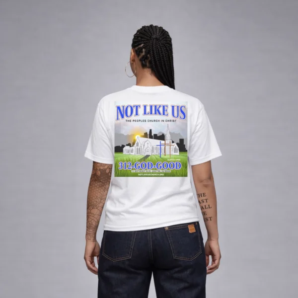 This oversized tee is a sacred remix of faith, fire and flow. WEST CHI reimagines Kendrick Lamar—America’s poetic prophet—as an Indigenous tribal chief, warrior of wisdom and spiritual gatekeeper. On the front, his profile is marked with electric blue cross’ across his face, a nod to battle and bloodlines, while eagle feathers drop like verses from his crown—each one a prayer, a poem, a warning. On the back of T-shirt and you’re taken to 111 Birthright Blvd. in Compton, where the fictional Not Like Us: The Peoples Church in Christ lights up the night. Three wooden crosses stand under a full moon while a Black church fades into silhouette—past, present and prophecy merge. This ain’t just a building—it’s a spiritual cipher and a cultural altar.