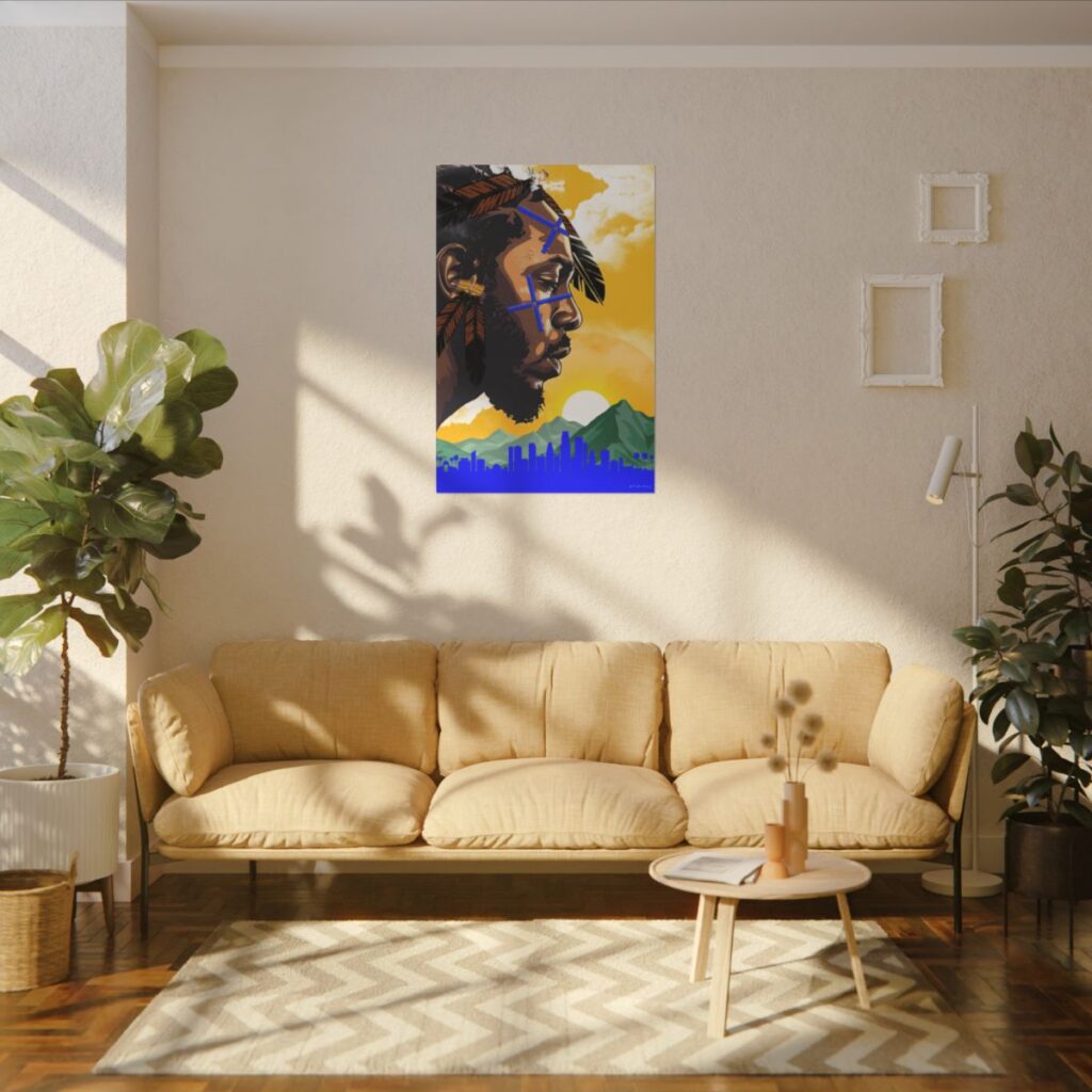 The WEST CHI collection lives at the intersection of music, memory and spiritual identity. As part of the Indigenous category, this piece reimagines Kendrick Lamar as an American Indian tribal leader—not as fantasy, but as metaphor. Kendrick’s role in culture has never been limited to entertainment; he operates as a modern-day griot, philosopher and community voice, carrying ancestral truths through contemporary language.