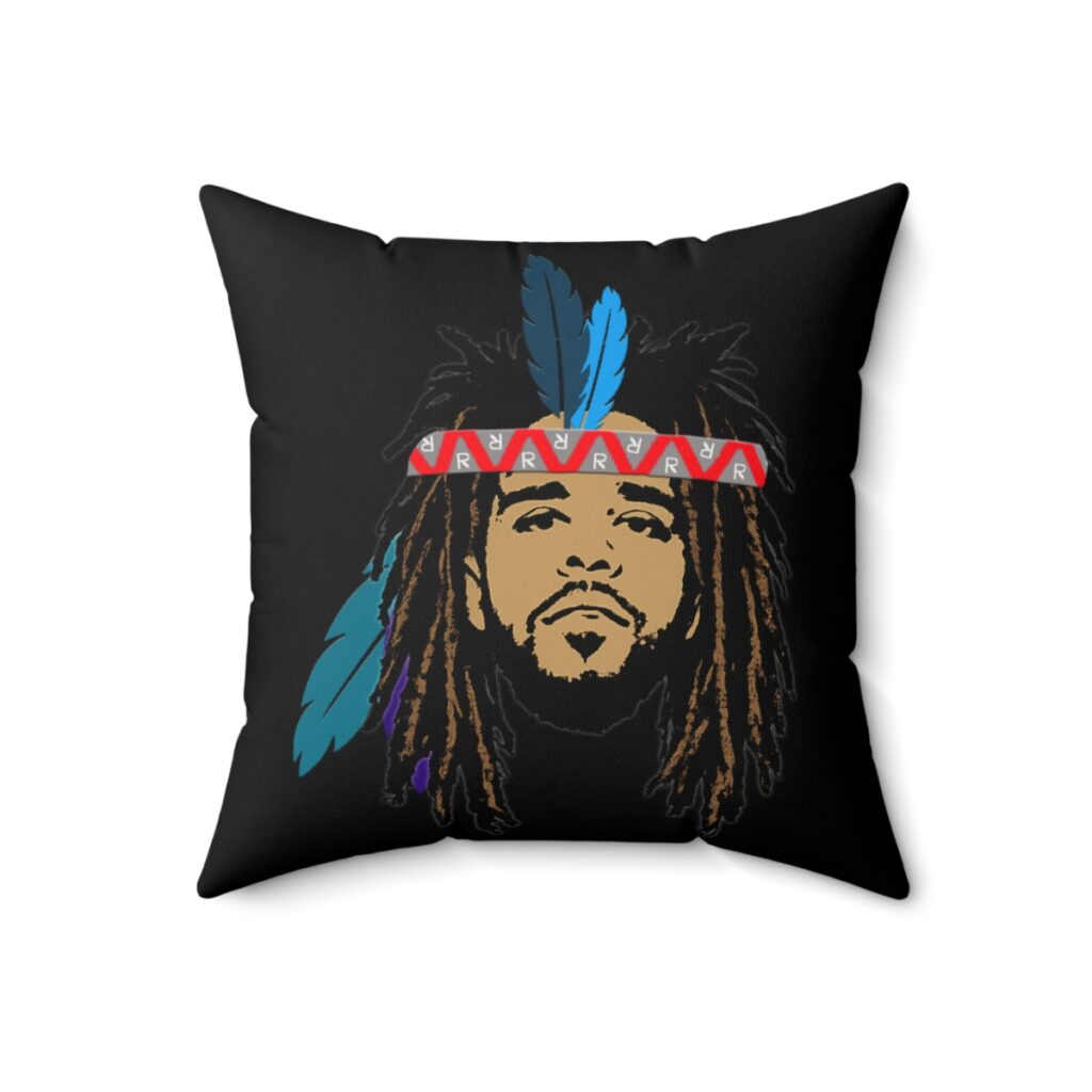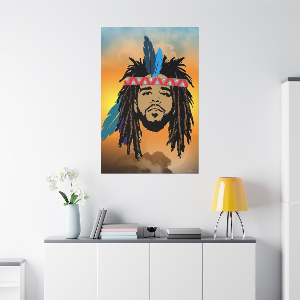 This piece reimagines J. Cole through symbolic American Indian imagery — not as costume, not as claim — but as metaphor. The headdress here represents earned leadership, spiritual grounding and responsibility to the people. Traditionally, headdresses were not fashion accessories. They were given for courage, service and discipline. That’s the energy Cole has carried for over a decade. Quiet authority. Measured intensity. Fire that doesn’t burn the village down.
